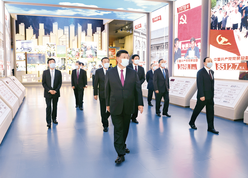 2021年6月18日,黨和國(guó)家領(lǐng)導(dǎo)人習(xí)近平、李克強(qiáng)、栗戰(zhàn)書、汪洋、王滬寧、趙樂際、韓正、王岐山等在中國(guó)共產(chǎn)黨歷史展覽館參觀“‘不忘初心、牢記使命’中國(guó)共產(chǎn)黨歷史展覽”?!⌒氯A社記者 鞠鵬/攝