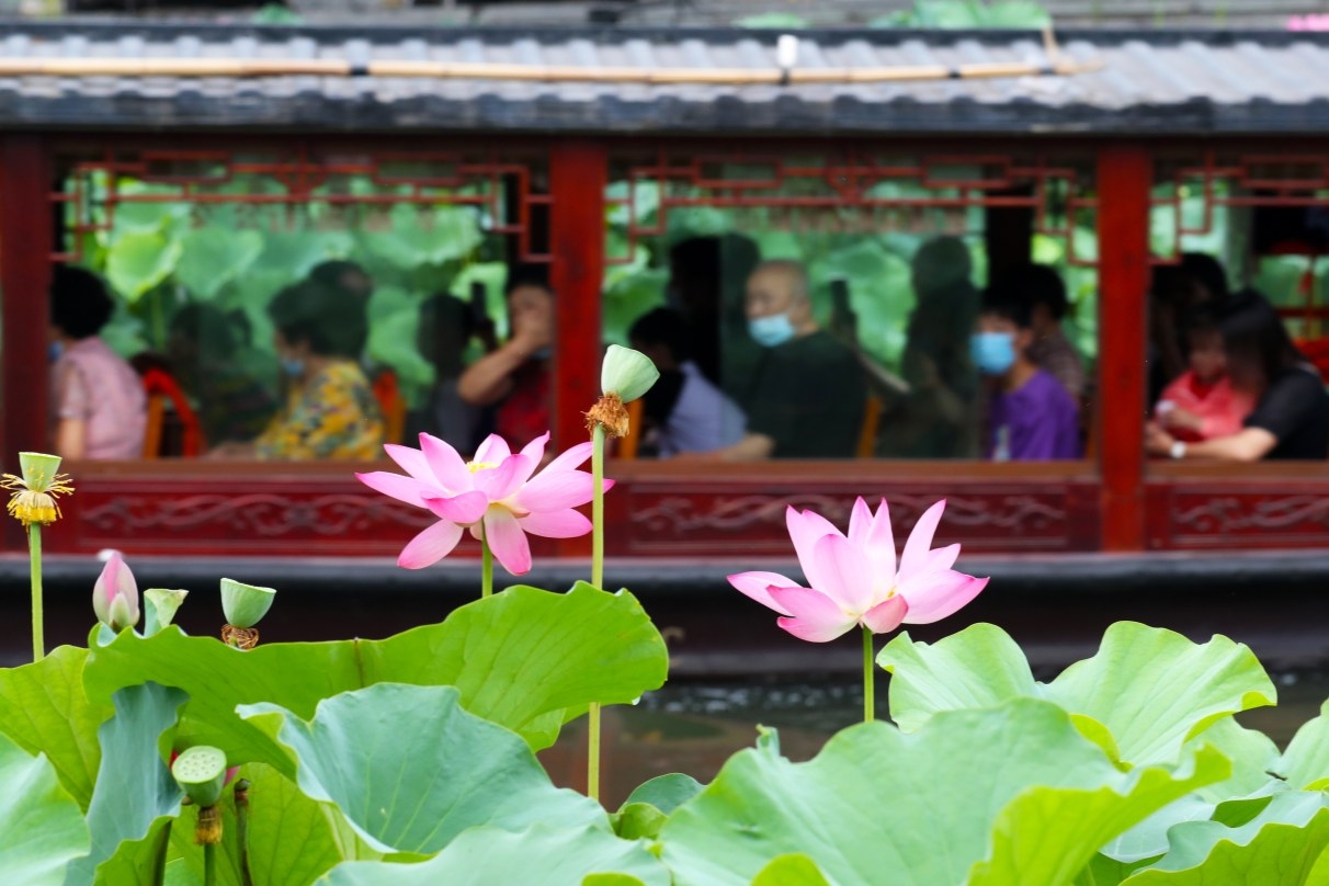 時下正是小暑時節(jié),市區(qū)護城河內(nèi)的荷花競相開放,散發(fā)出陣陣清香,吸引眾多市民和游客泛舟湖面,前來觀賞。
