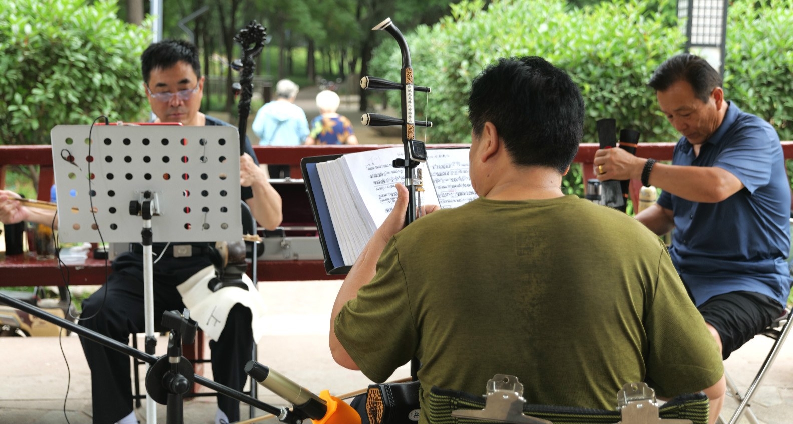 這個(gè)季節(jié),清潩河碧波蕩漾,河兩岸綠樹蔥蘢。在八一路以北清潩河段有一風(fēng)景宜人的休閑廣場。幾乎每天早晨和晚間,都有許多市民在這里或練習(xí)太極劍,或散步,或慢跑,或利用運(yùn)動(dòng)場地上的健身器材鍛煉身體。除此之外,這里也有多處涼亭,許多文藝愛好者喜歡在涼亭里吹拉彈唱。本期《文化圈》,我們走近這里的戲曲愛好者,聽他們講述與戲曲結(jié)緣的故事。