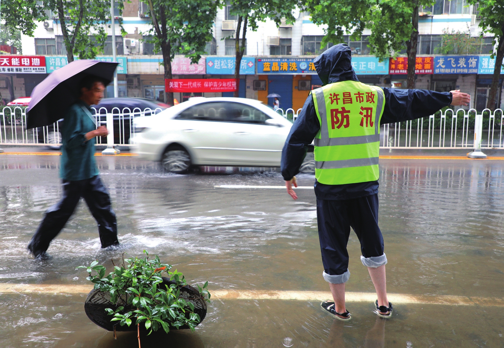 7月21日,市區(qū)八一路,一位市政工作人員冒雨站在窨井附近指揮行人通過積水路面。本報記者 譚宜姝 攝
