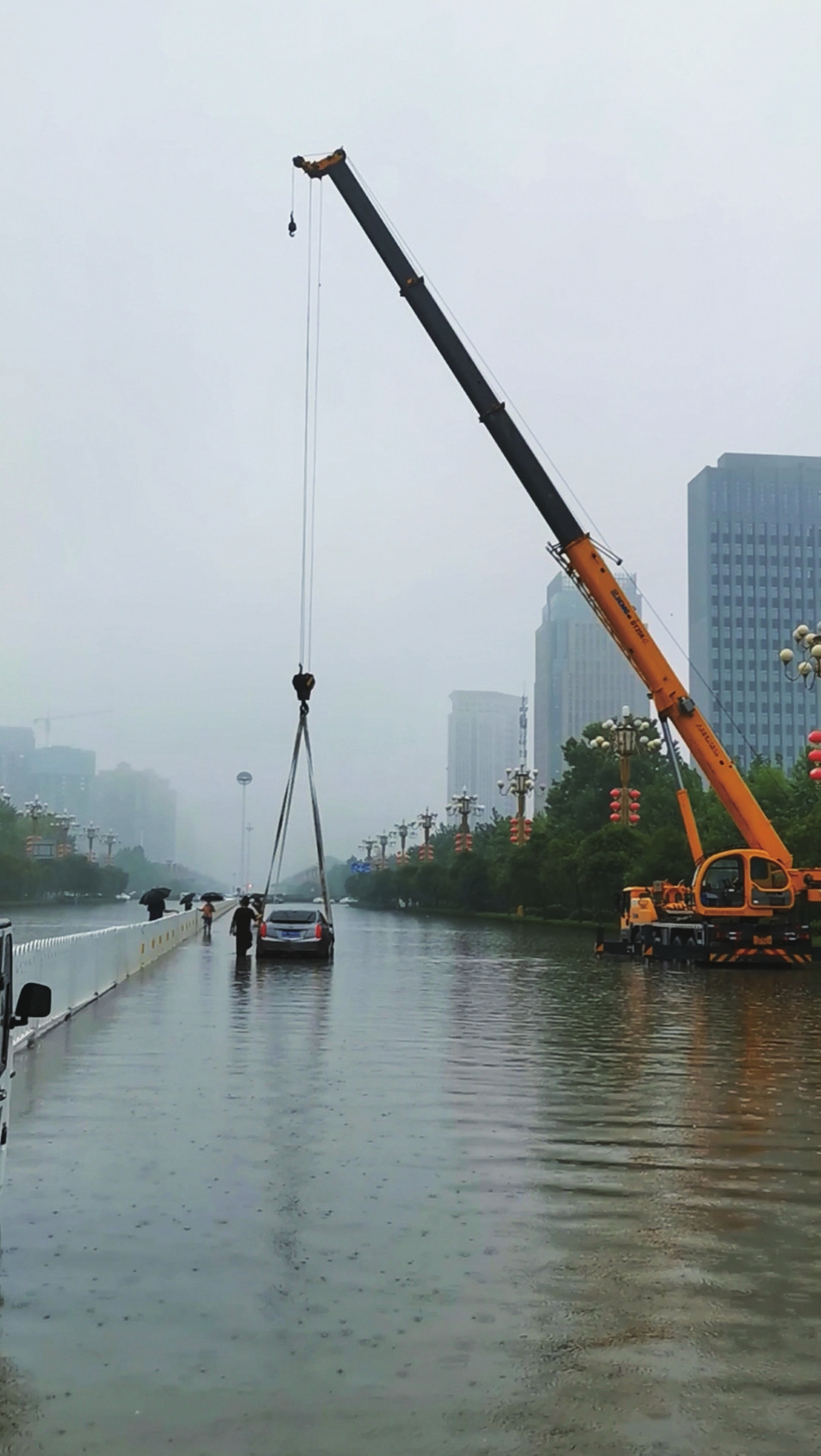 7月20日,救援人員使用大型設備轉(zhuǎn)移被困車輛。陳晨 攝