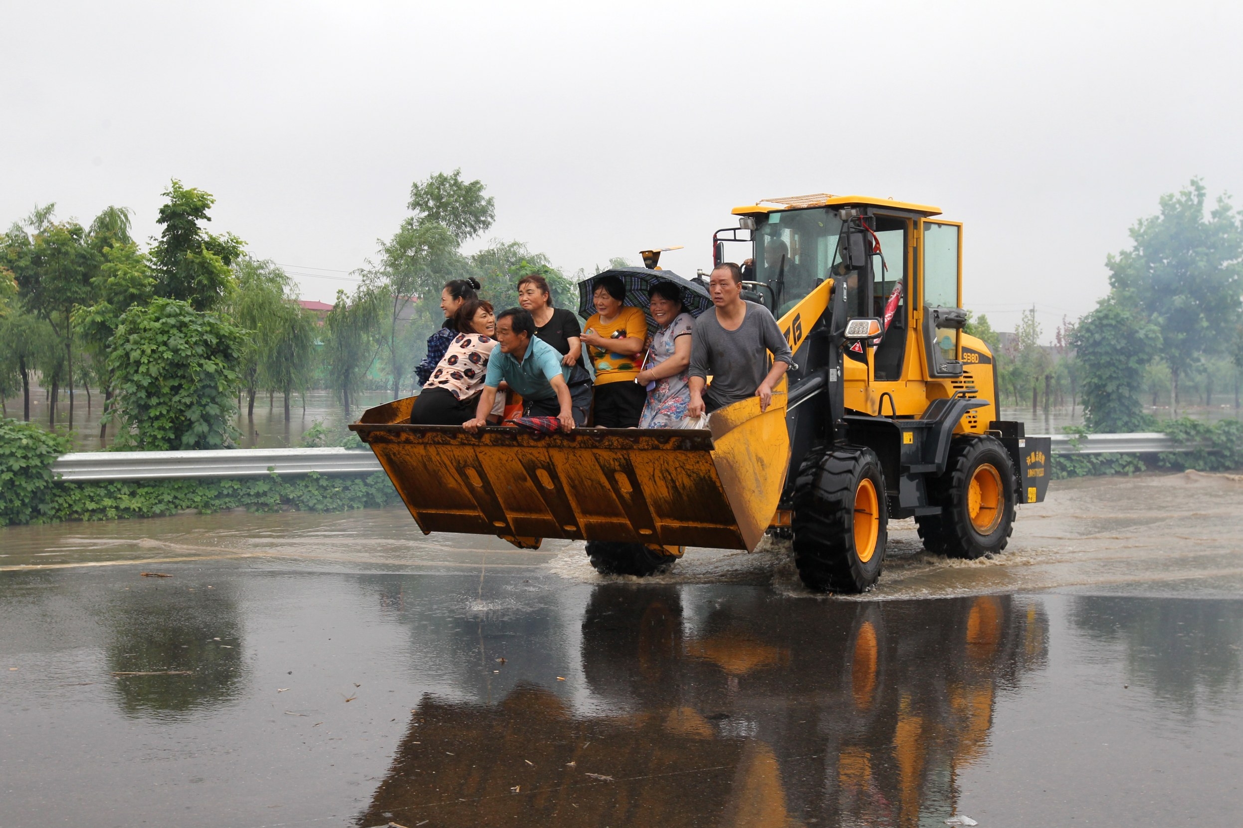 7月21日,在長葛市大周鎮(zhèn)小河董村,防汛救災人員利用鏟車緊急疏散和轉移被困群眾。本報記者 牛書培 攝
