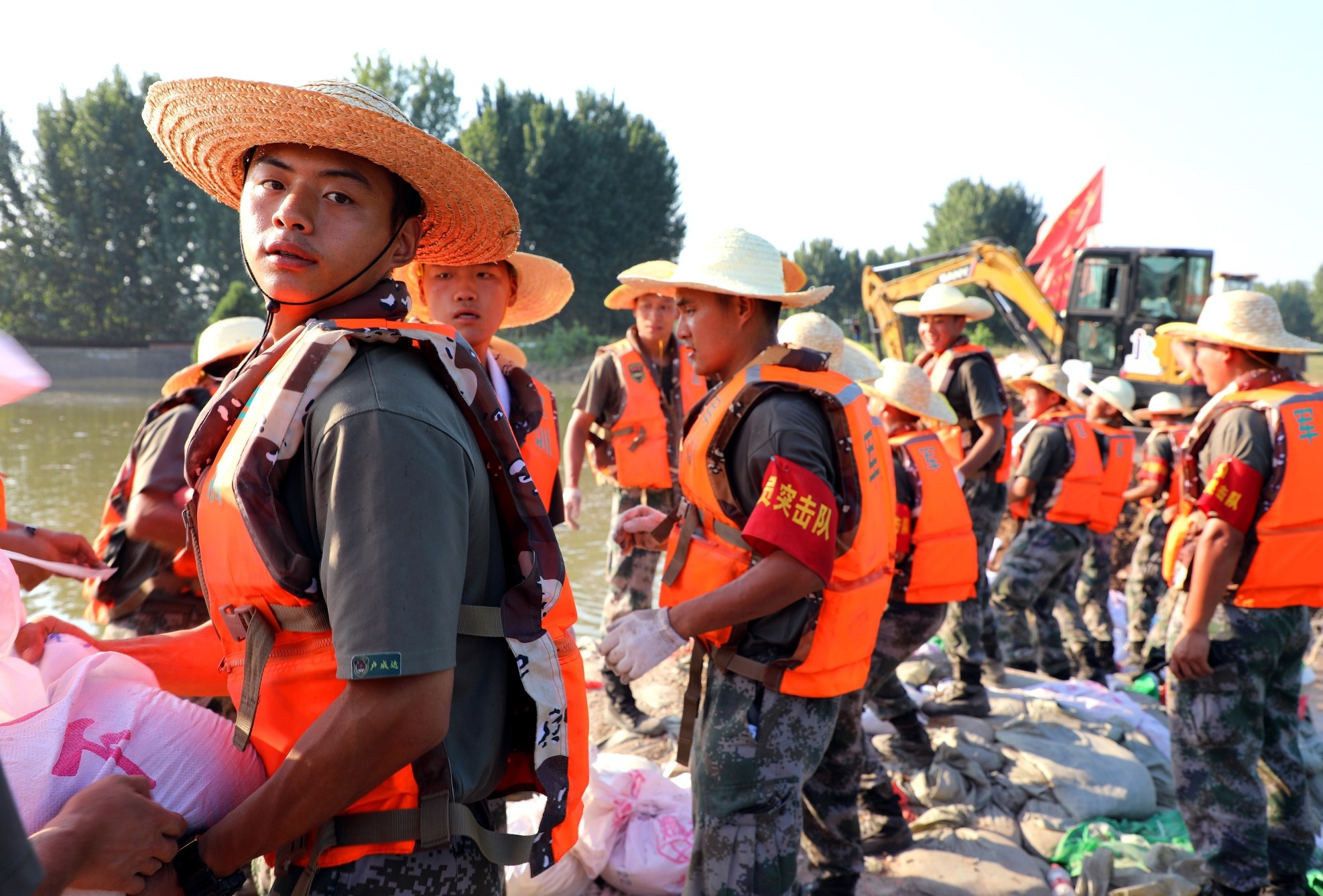7月25日,楊根思部隊官兵在長葛市雙洎河徐王趙村段決堤口進(jìn)行填堵。經(jīng)過奮戰(zhàn),雙洎河徐王趙村段決口處于7月25日17時30分成功合龍。 記者 譚宜姝 攝