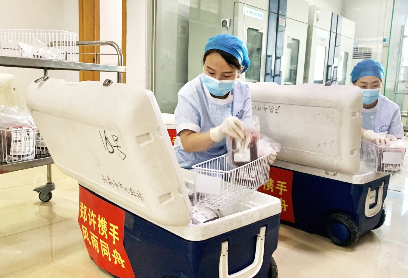 該站供血科工作人員將血液裝箱。