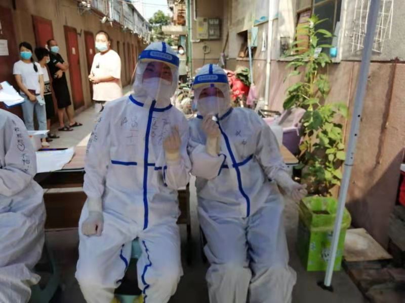 8月6日上午,趙文莉暫時(shí)沒有外出任務(wù),她在各個(gè)病房不停地跑來跑去,盡可能減輕大家的工作量。護(hù)士長(zhǎng)張艷一直催她趕緊去休息,但是看到醫(yī)院里忙碌的情景,她怎么也不愿放下手里的活兒。下午3點(diǎn),接到新任務(wù),趙文莉和同事立馬趕往許昌市建安區(qū)昌盛街道辦事處張莊社區(qū),3個(gè)小分隊(duì)6名隊(duì)員,面對(duì)3000人的任務(wù)量,大家頭皮都發(fā)麻。趙文莉和隊(duì)員們認(rèn)真地給每一位居民檢測(cè),提醒他們做好個(gè)人防護(hù)。她們不厭其煩地提醒著,一個(gè)個(gè)嗓子都啞了。