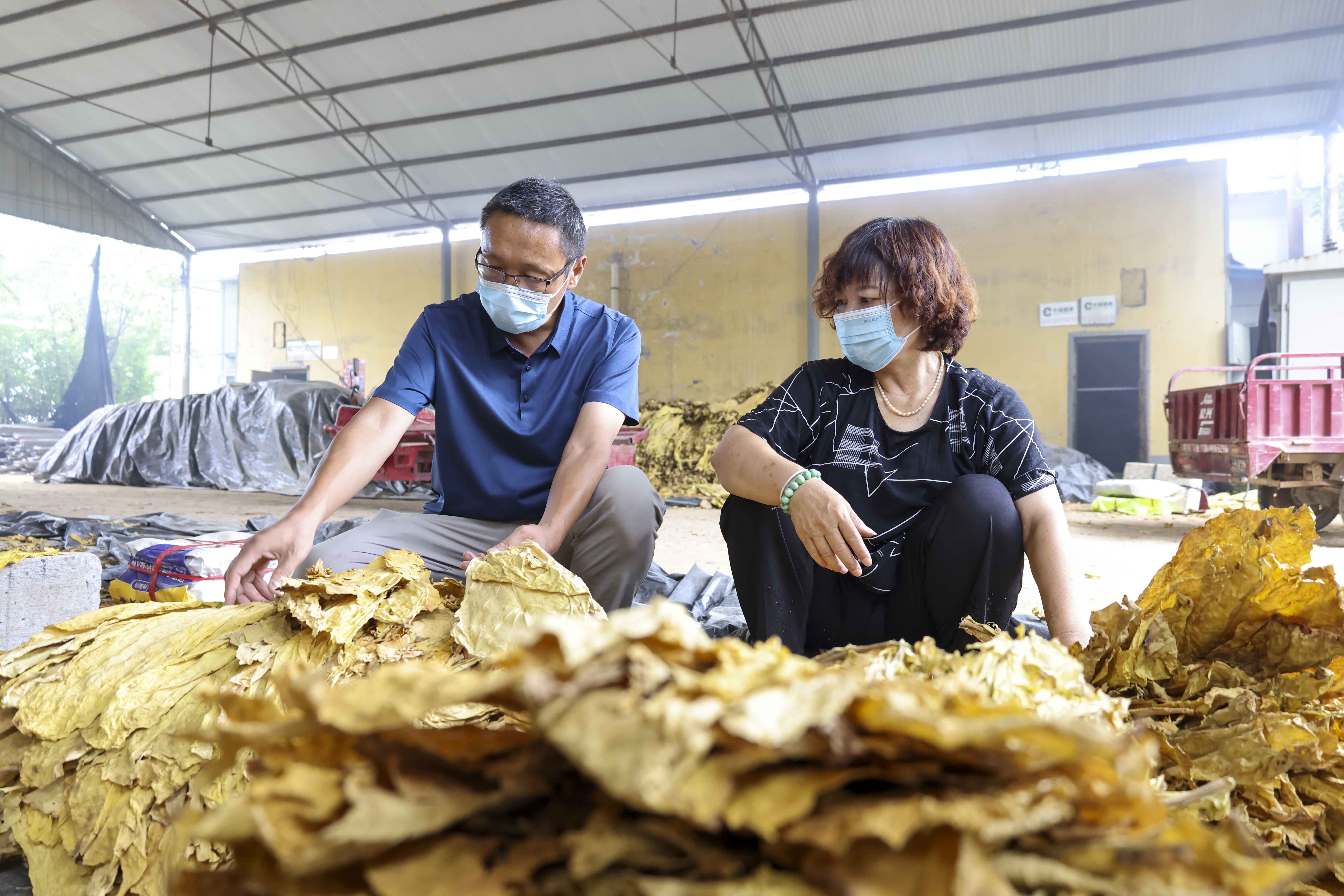 2021年8月16日,河南省許昌市襄城縣王洛鎮(zhèn)閆寨村煙葉烘烤工場(chǎng),襄城縣煙草分公司煙葉生產(chǎn)科科長(zhǎng)曹曉濤(左)指導(dǎo)煙農(nóng)對(duì)烤后煙葉進(jìn)行分揀。 姜昊楠攝
