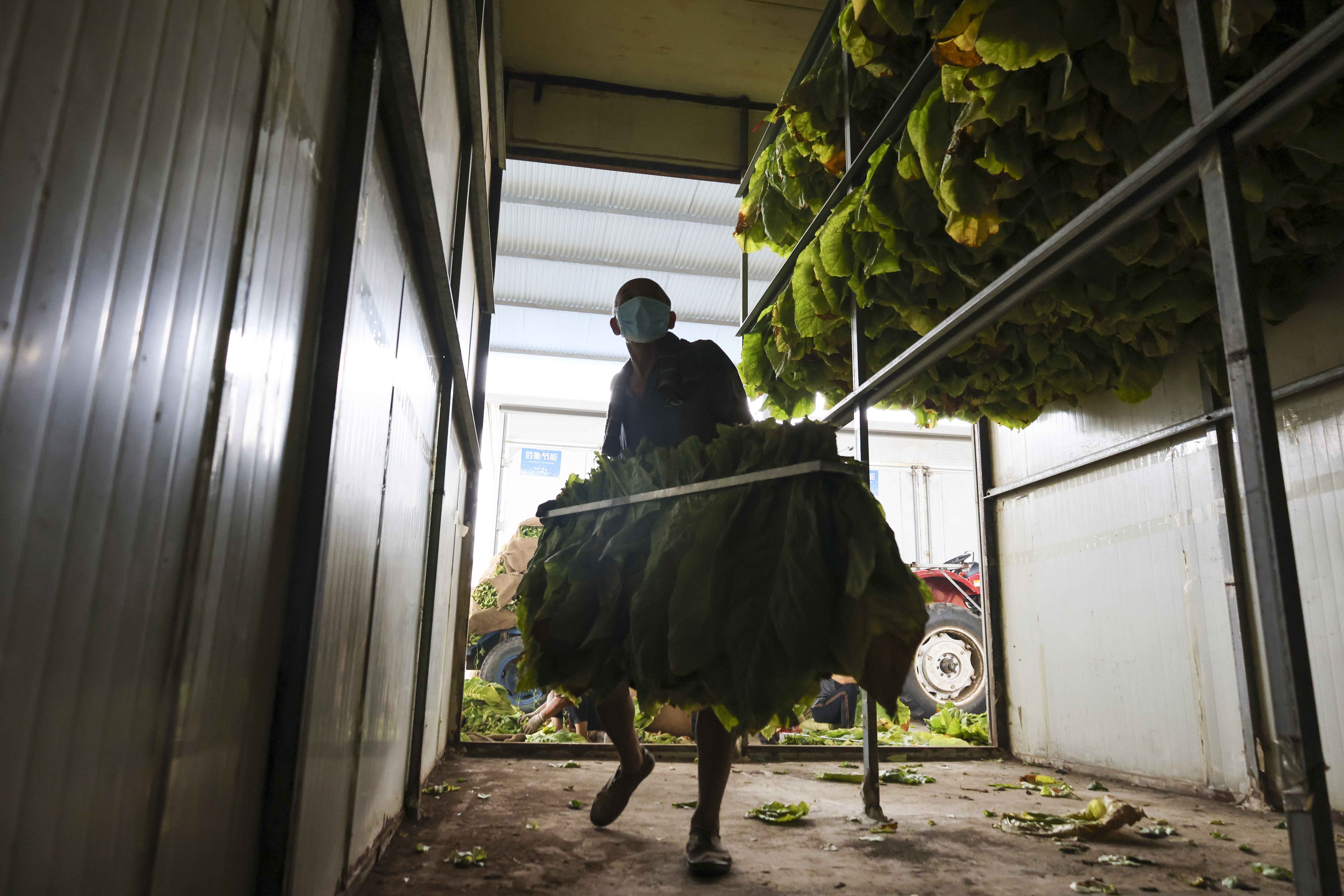 2021年8月16日,河南省許昌市襄城縣王洛鎮(zhèn)仲王村煙葉烘烤工場(chǎng),煙農(nóng)正在將編桿后煙葉裝炕烘烤。姜昊楠攝