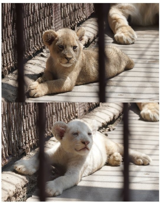 這兩只小獅子,一只毛色發(fā)白,一只毛色為棕色。經(jīng)過工作人員兩個(gè)多月的觀察推測(cè),白色小獅子為母獅,性格較強(qiáng),會(huì)護(hù)食和搶食。棕色小獅子為公獅,性格較溫順。公獅是“哥哥”,母獅是“妹妹”。