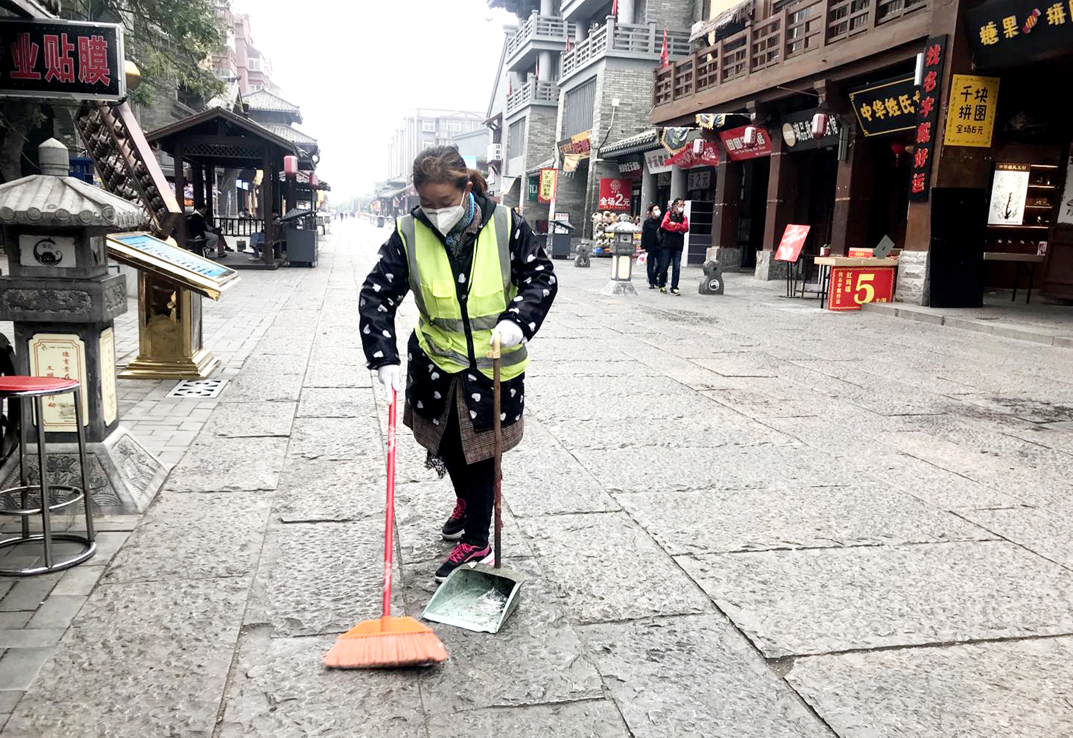 10月19日,在市區(qū)曹魏古城內(nèi),文明志愿者清掃垃圾,確保路面干凈整潔。