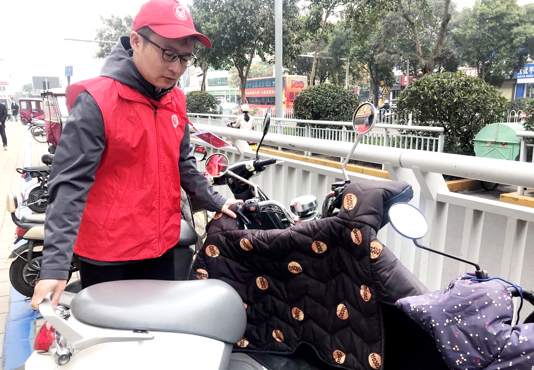 10月19日,在市區(qū)七一路上,文明志愿者擺放電動車,確保停車入位、朝向一致。