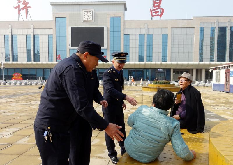 10月21日 ,許昌火車站廣場,市城市管理綜合執(zhí)法支隊火車站治理辦公室工作隊員提醒群眾不要把座椅當成躺椅,注意自身形象。黃增瑞 攝