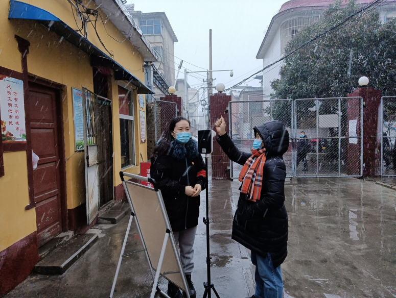 1 月 4 日 下 午 ,在 魏 都 區(qū) 軍休一所家屬院疫情防控檢查點(diǎn),工作人員為進(jìn)入小區(qū)的居民測(cè)量體溫。當(dāng)日,許昌遭遇風(fēng)雪天氣,在市區(qū)各個(gè)疫情防控檢查卡點(diǎn),工作人員和志愿者不畏風(fēng)雪,堅(jiān)守崗位。許廷合 攝