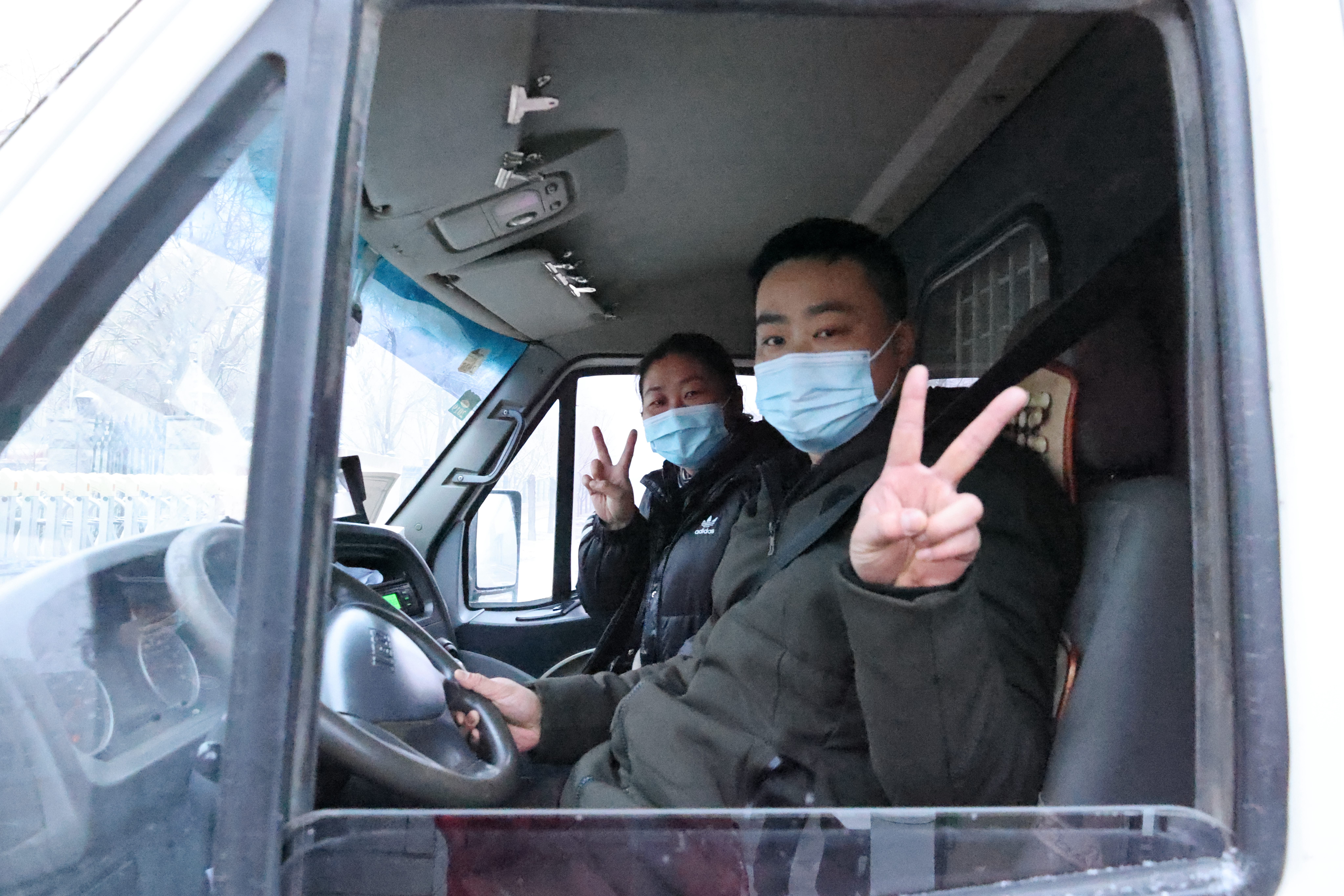 02 今天是一個(gè)月來(lái)第一次送貨到戶,昨夜剛下過(guò)雪,早晨大霧彌漫,送貨員關(guān)敏、黃曉勇比出勝利手勢(shì)預(yù)祝順利。