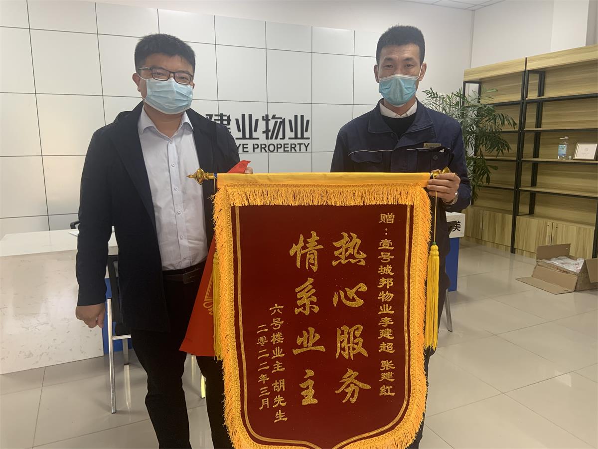 本報(bào)訊(記者 秦水淼 通訊員 劉峰麗)3月30日,建業(yè)壹號(hào)城邦6號(hào)樓業(yè)主胡先生將一面寫有“熱心服務(wù) 情系業(yè)主”字樣的錦旗送到建業(yè)物業(yè)壹號(hào)城邦物業(yè)服務(wù)中心,感謝物業(yè)工作人員李建超、張建紅的幫助。