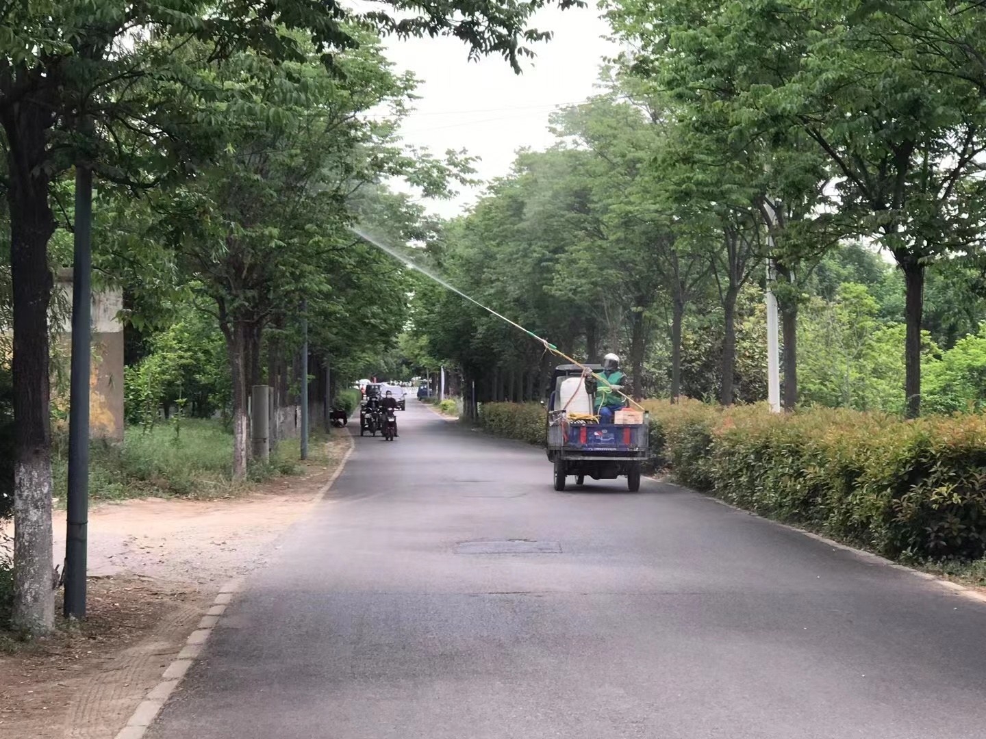 園林工人在百花路對(duì)黃山欒樹進(jìn)行噴藥。