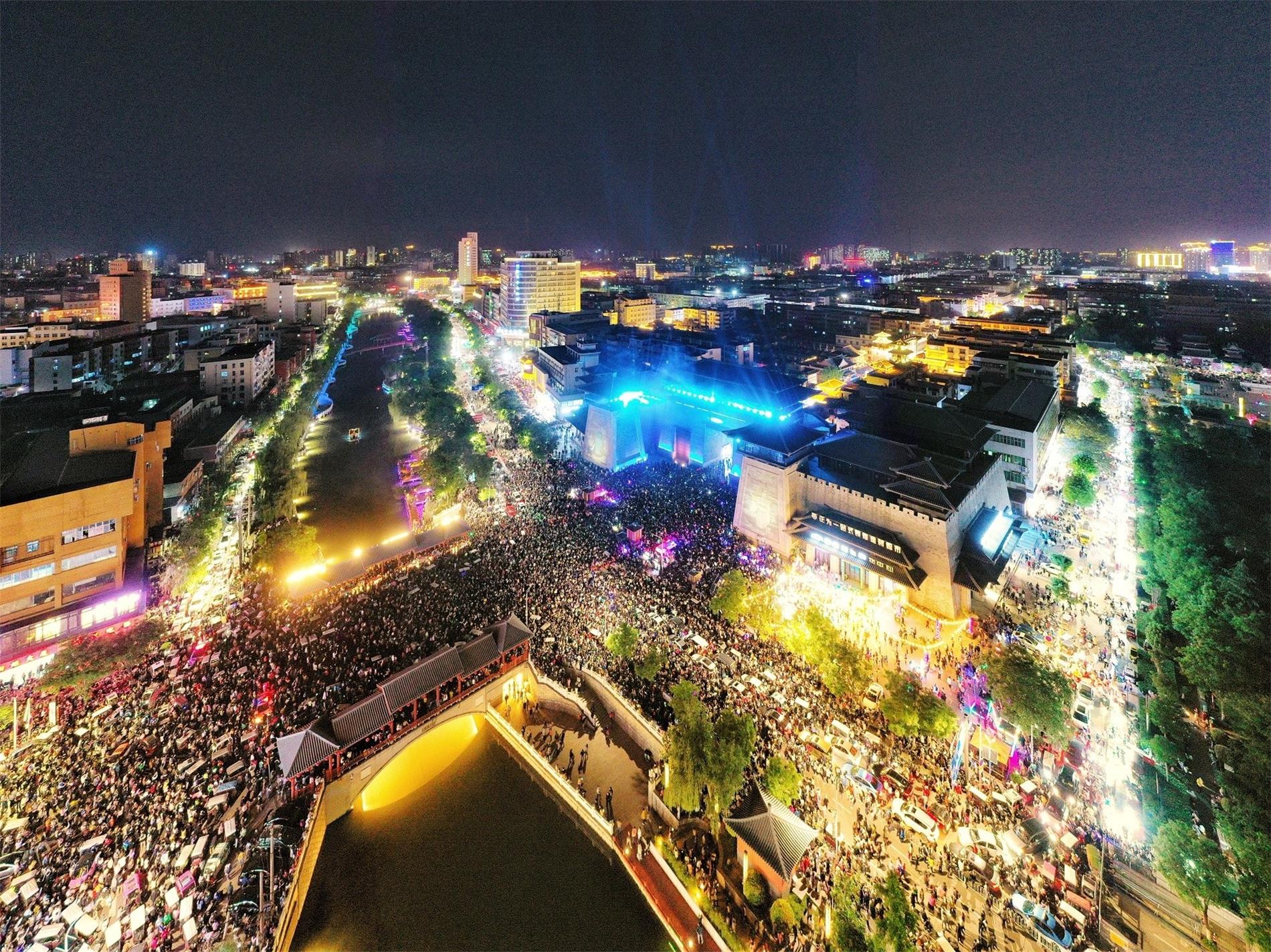 5月7日晚,曹魏古城南城門(mén)舉辦燈光秀,吸引眾多市民前來(lái)觀看。圖為燈光秀現(xiàn)場(chǎng)。 本報(bào)記者 牛書(shū)培 攝