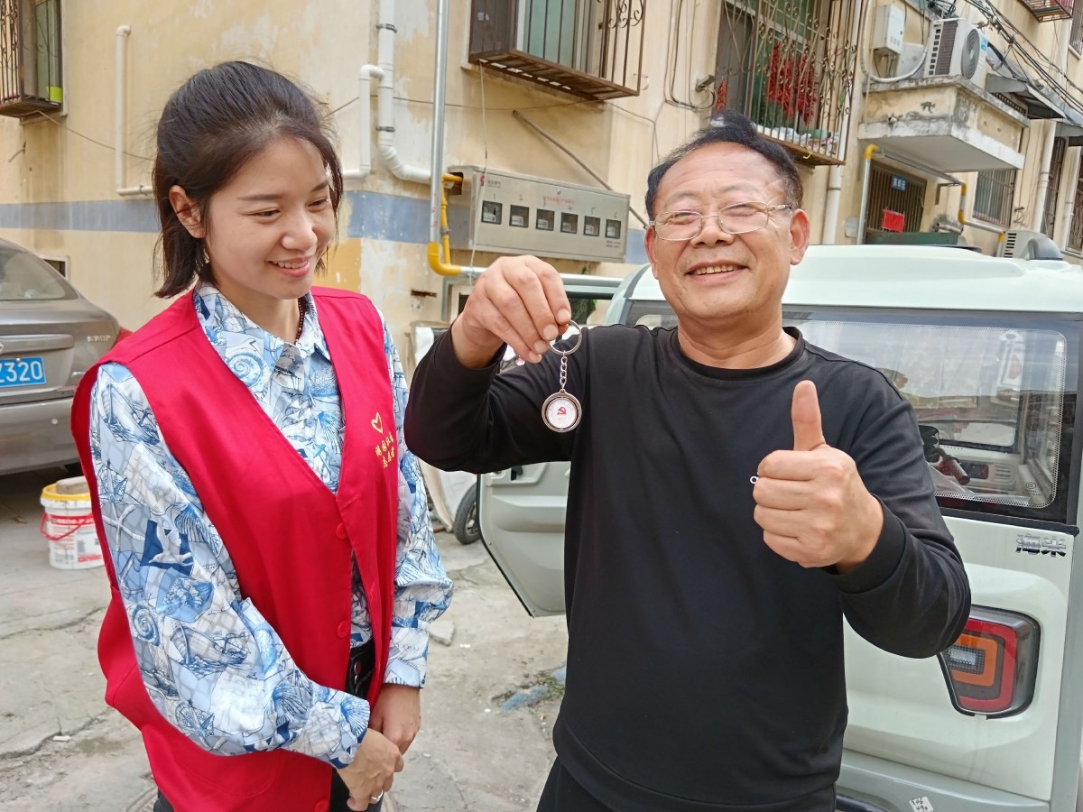 社區(qū)工作人員為轄區(qū)黨員送小鑰匙扣。本報(bào)記者 孫江鋒 通訊員 楊蓓 攝