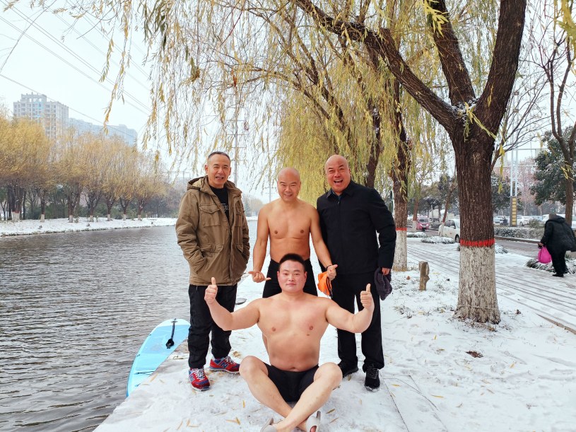 當(dāng)日清晨,在東城區(qū)飲馬河畔的許昌市冬泳協(xié)會(huì)飲馬河冬泳俱樂(lè)部,泳友們陸陸續(xù)續(xù)地趕來(lái)冬泳。雪中的飲馬河顯得比平時(shí)靜謐一些,岸邊皚皚白雪覆蓋著大地,更添幾分寒意。冬泳愛(ài)好者們卻毫不畏懼,一番熱身運(yùn)動(dòng)之后,相繼跳入飲馬河“劈波斬浪”?!笆娣〉脛艃?!”出水后,有的人還會(huì)大喊幾聲。