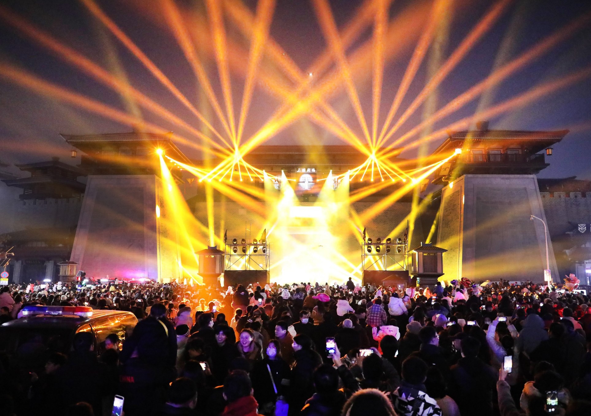 2023年12月31日晚,市區(qū)曹魏古城燈光璀璨,人頭攢動。元旦假期期間,我市舉辦迎新春大型跨年文化演出活動,吸引眾多市民及游客前來觀看,迎接新年的到來。本報記者 喬利峰 攝
