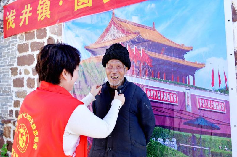 淺井村一座古建筑的紅石墻上,掛著一塊“北京天安門(mén)”背景布,在初冬的陽(yáng)光下顯得格外“耀眼”。不遠(yuǎn)處,身穿紅馬甲的志愿者李俊安、李亞星正在給老人理發(fā)。理完發(fā)的老人們已自覺(jué)排好隊(duì),等著跟“北京天安門(mén)”合影。