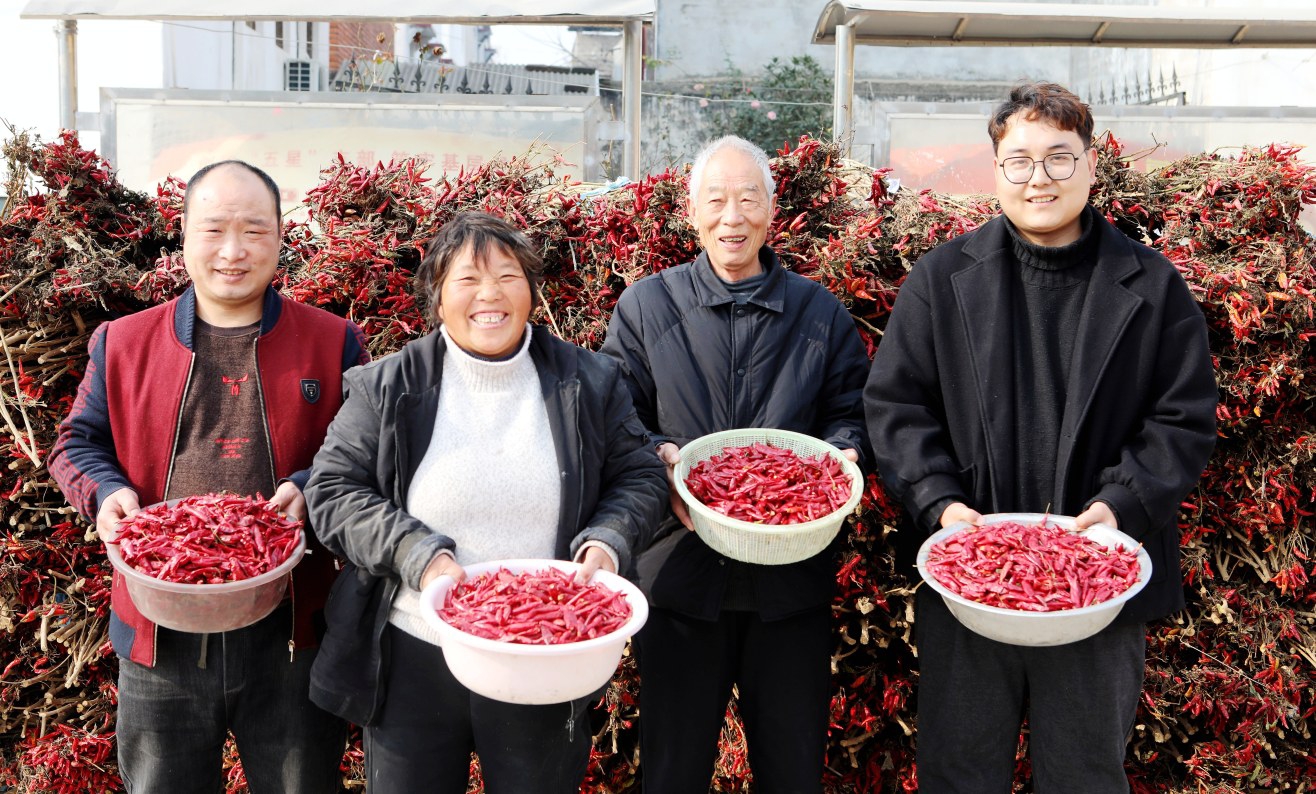 社區(qū)居民在大曬場展示自家種的辣椒,臉上洋溢著幸福的笑容。