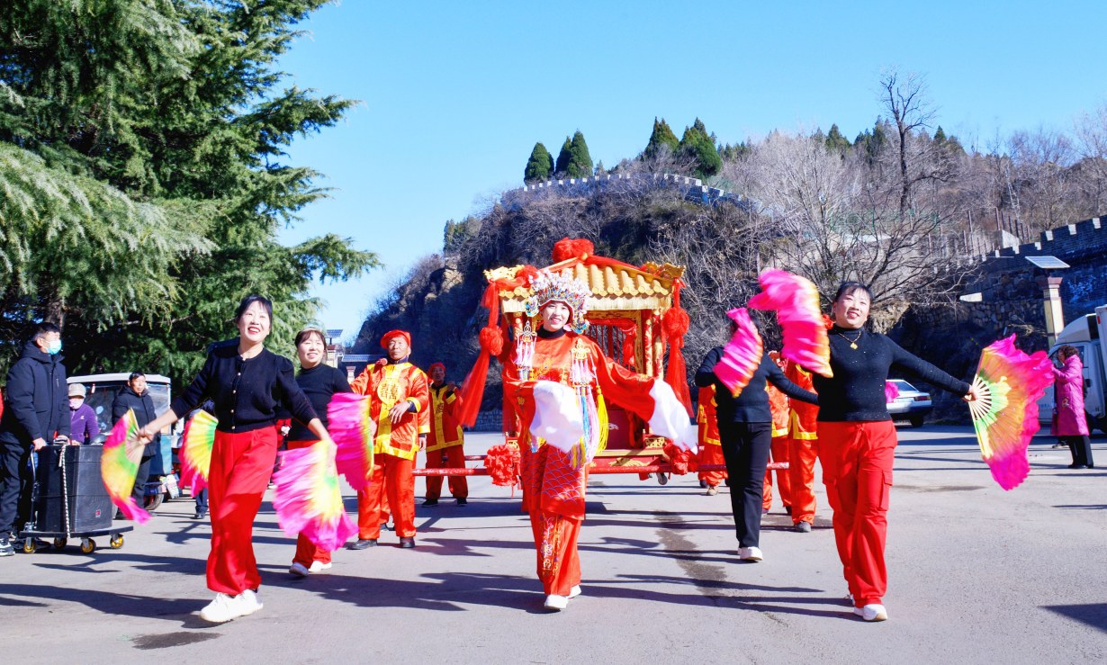 穿戴紅色喜服、鳳冠霞帔的村民王云彩,穿過隊友舞動的扇子,邁步登上大紅花轎,拉開了大澗村周末鄉(xiāng)村文化大集的序幕?!拔幕蠹瘎傞_始,我們就在一起演出,既能鍛煉身體,也能吸引游客來我們大澗,感到很高興,也很自豪?!蓖踉撇市v如花。