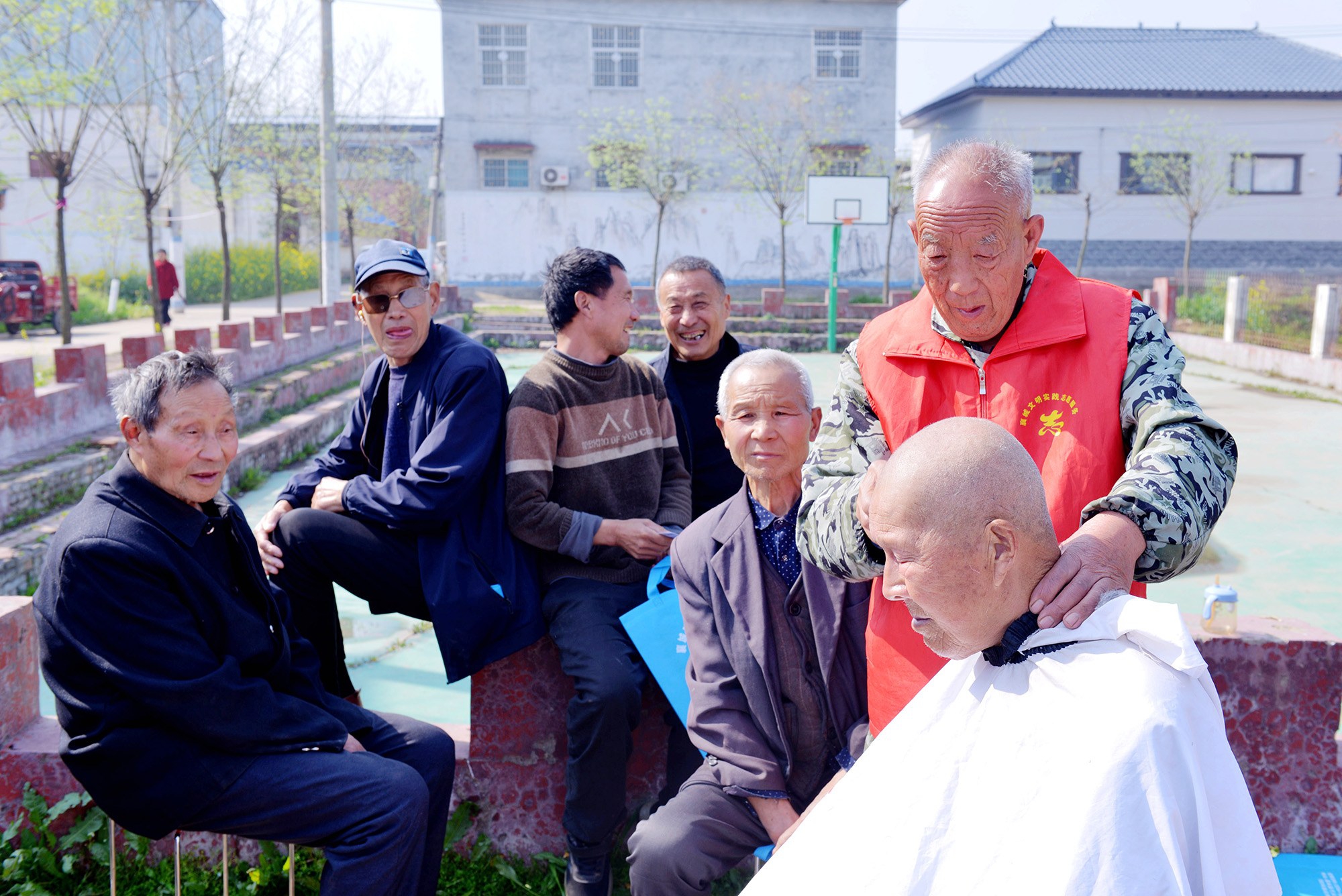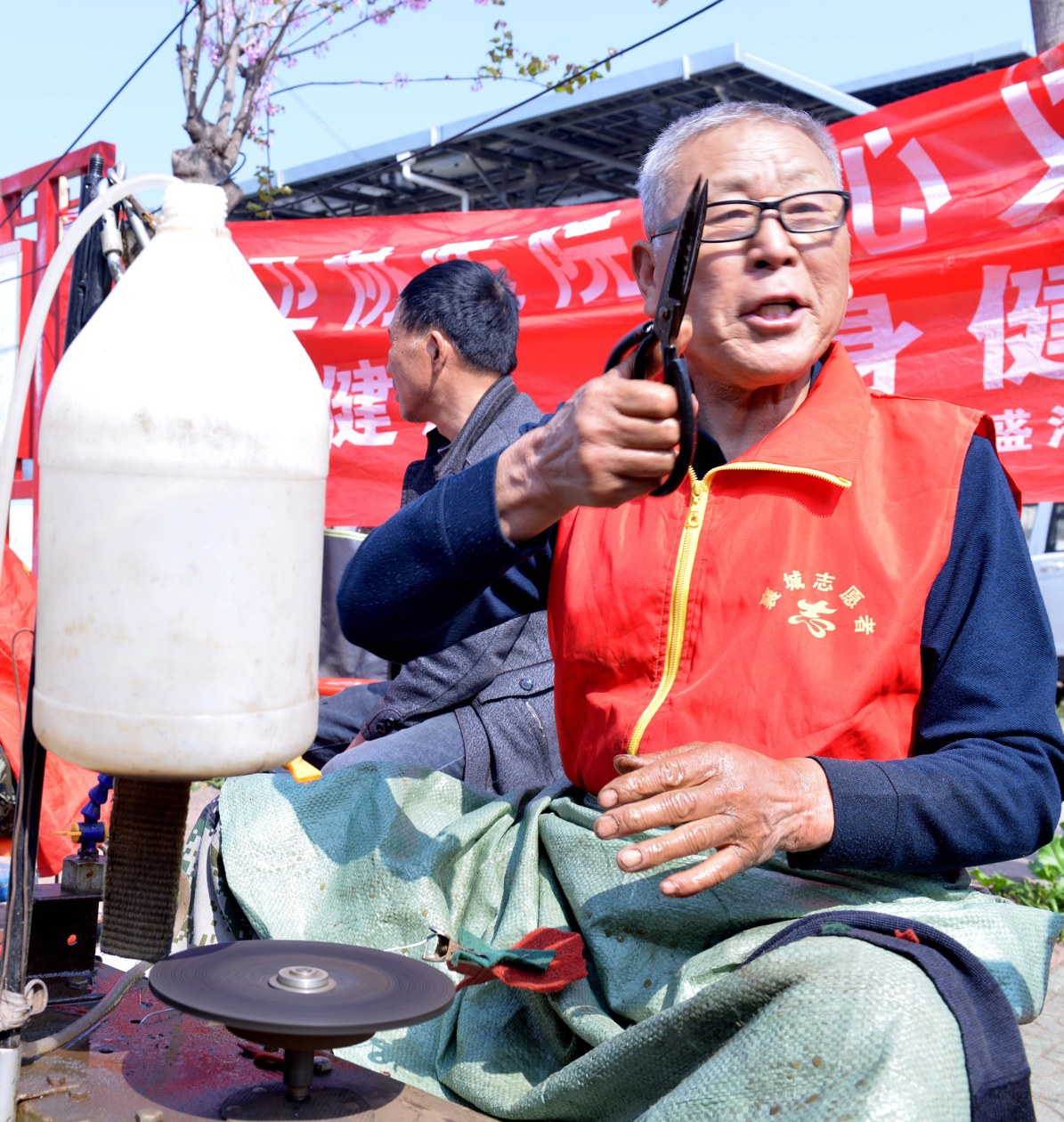 當日9時許,文化廣場上早已暖意融融。接到通知的老人三五成群,步履緩緩匯聚而來,臉上滿是期待。小彩鳳曲劇團的志愿者登臺獻藝,婉轉(zhuǎn)悠揚的傳統(tǒng)唱腔縈繞耳畔,皆是老人耳熟能詳?shù)慕?jīng)典曲目,每一段唱罷都會引來陣陣掌聲與喝彩;義剪區(qū),3位志愿者凝神細致,為30余名老人修剪發(fā)絲,褪去滄桑;磨刀攤前,銹跡斑斑的刀具在巧手下重煥锃亮光澤;義診區(qū),醫(yī)生耐心為老人測量血壓,問診把脈,細致講解養(yǎng)生知識,點滴關(guān)懷溫暖人心?!皭坌奈绮痛笈褴嚒迸裕辶恢驹刚叻止f(xié)作,切肉、洗菜、炸豆腐,忙碌的身影勾勒出最動人的春日圖景。